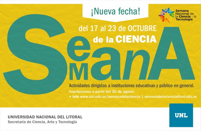 La Semana de la Ciencia de la Universidad Nacional del Litoral (UNL) se desarrollará entre el miércoles 17 y martes 23 de octubre en Santa Fe, Esperanza, Reconquista, Gálvez y Rafaela. La programación, que incluye más de 100 propuestas para instituciones educativas de nivel primario, secundario y