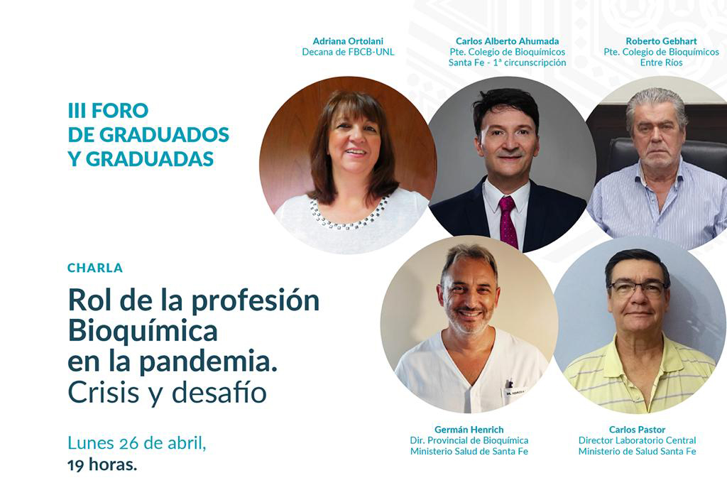 En la continuidad del III Foro de Graduados y Graduadas de la Universidad Nacional del Litoral este lunes 26 de abril a las 19 se concretará la charla “Rol de la profesión Bioquímica en la pandemia. Crisis y desafíos”. La propuesta será virtual y contará con la participación de Adriana Ortolani, Decana de la Facultad de Bioquímica y Ciencias Biológicas (FBCB-UNL); Carlos Alberto Ahumada, Presidente Colegio de Bioquímicos Santa Fe, 1ª circunscripción; Roberto Gebhart, Presidente Colegio de Bioquímicos Entre Ríos; Germán Henrich, Director provincial de Bioquímica del Ministerio de Salud de la Provincia de Santa Fe; y Carlos Pastor, Director Laboratorio Central -Min. de Salud de Santa Fe, del Ministerio de Salud de la Provincia de Santa Fe.